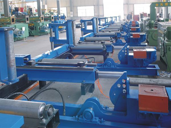 La máquina de carga para almas de vigas está diseñada para trasladar las placas a diferentes estaciones de trabajo. El brazo rotativo cuenta con un potente electroimán que se utiliza para girar el alma hacia la línea central del lecho de rodillos.